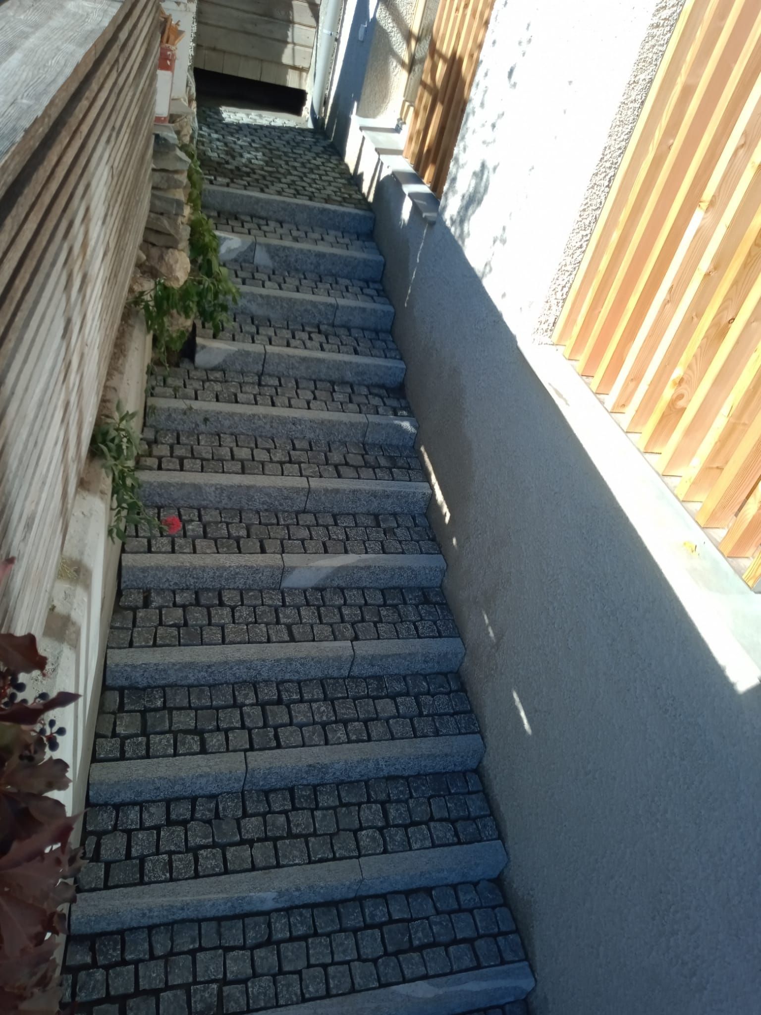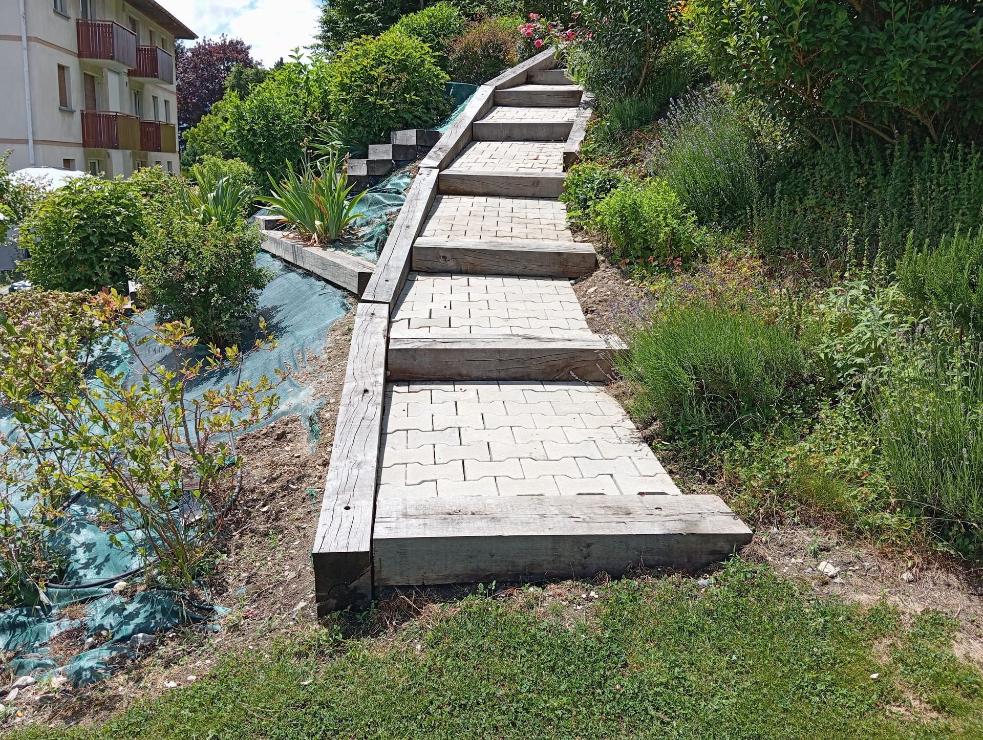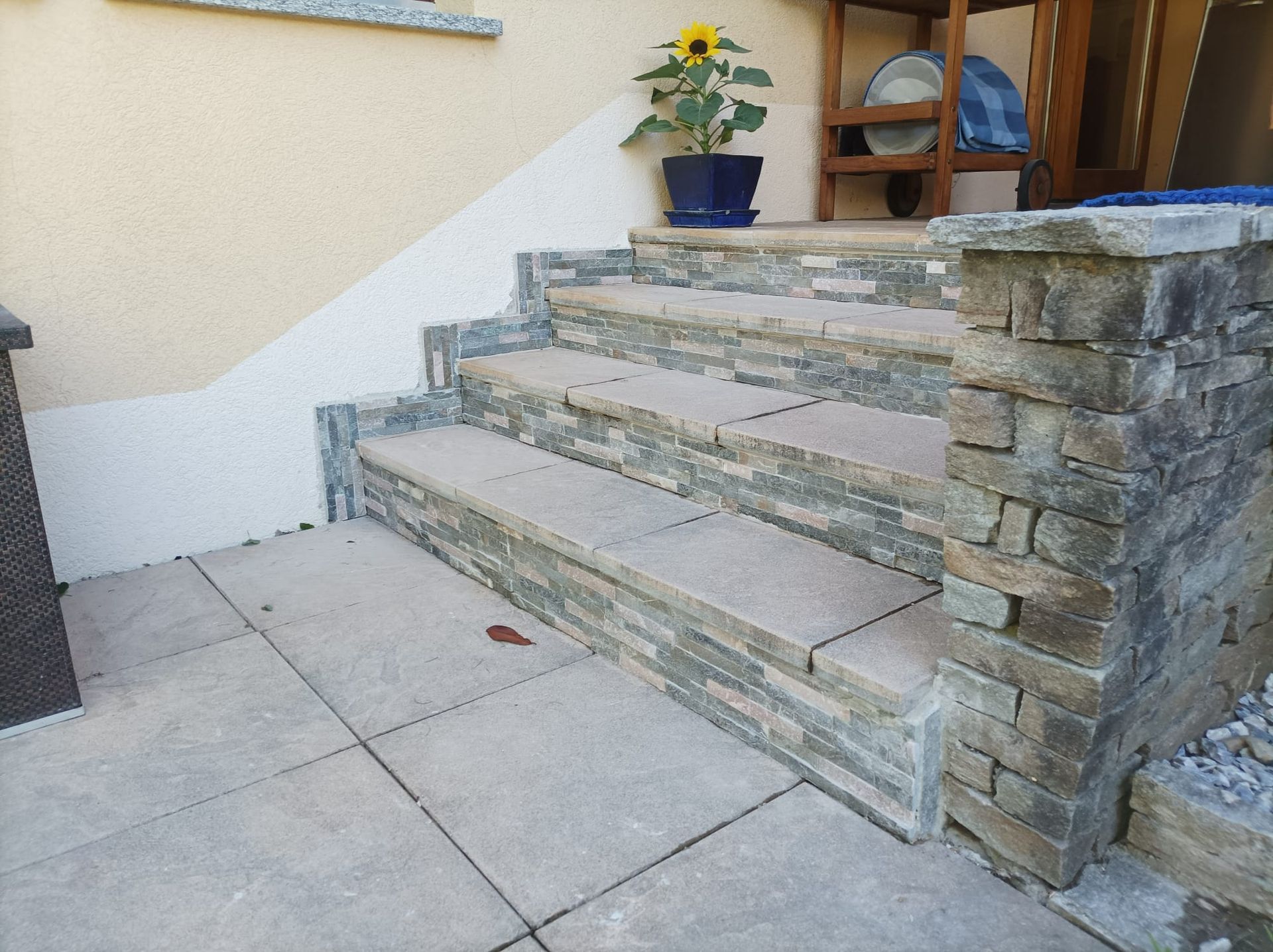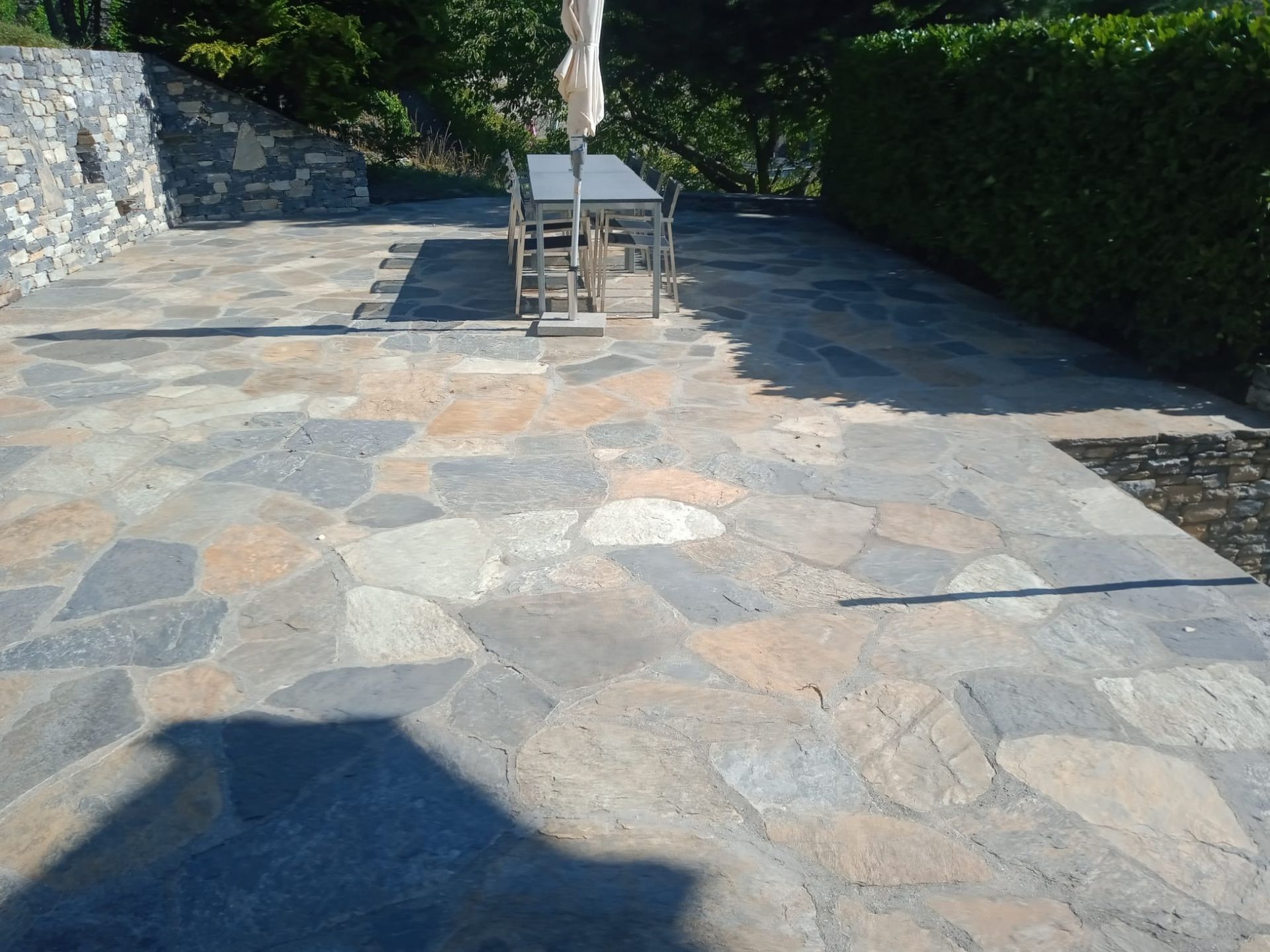 - Terrasses : Création de terrasses en pierres naturelles, bois, dalles ou gravier-époxy, alliant fonctionnalité et élégance.